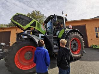Die Gruppe Landmaschinenschlosser konnte in der Werkstatt verschiedene Maschinen und Werkzeuge, die zur Reparatur und Instandhaltung eingesetzt werden, kennenlernen. Am meisten fesselte uns aber der neuste und größte Traktor auf dem Hof: der Claas AXION 960. Besonders beeindruckt waren wir nicht nur von seiner Größe, sondern auch davon, dass er Aufgaben GPS-gesteuert fast ohne menschliches Zutun erledigen kann.