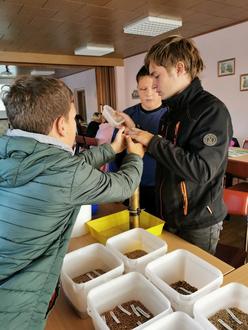Anschließend stellten uns Frau Niederle, Frau Henkel und Herr Haufe die drei Ausbildungsberufe der Agrargesellschaft - Landwirt/in, Land- und Baumaschinenmechatroniker und Kauffrau/mann für Büromanagement - vor. Eingeteilt in drei Gruppen konnten wir die drei Berufe genauer unter die Lupe nehmen. Im Bereich Landwirtschaft galt es Getreidesorten zu erkennen und zu überlegen, wozu die einzelnen Sorten benötigt werden. Auch kosten durften wir die verschiedenen Körnchen. Die nächste Aufgabe war das Abwiegen von einem Liter Getreide mittels eines Getreideprobers. Danach wurde uns noch das Thema „Bodenerosion“ anhand von Beispielen erklärt und wir konnten selbst Erosion durch Wasser simulieren.