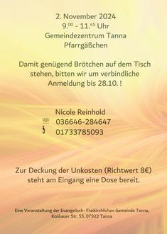 | Sonntag, 20.10.24 | 10.00 Uhr mit Christen aus Tanna und Schleiz |