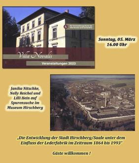 Der blaue Saal in der Villa Novalis war zur Überraschung der Protagonisten bis auf den letzten Platz belegt! Anlass dafür war der in den regionalen Medien (OTZ, Hirschberger Anzeiger) sowie auf Instagram angekündigte Vortrag von 3 Schülerinnen des Gymnasiums „Dr. Konrad Duden“ in Schleiz zum Thema: „Die Entwicklung der Stadt Hirschberg unter dem Einfluss der Lederfabrik im Zeitraum 1864-1993.“