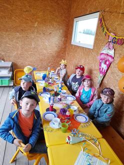 Den Zuckertütenbaum hatten die Kinder fleißig gegossen, damit die Zuckertüten wachsen konnten. Die Zahnlücken hatten eine Schatzkarte gefunden, die sie zu einer Schatztruhe führen sollte. Der Weg wurde von den Feen mit Glitzer markiert. Sie liefen einer weiten Strecke der Karte nach. Auf dem Weg dorthin, mussten sie verschiedene Aufgaben lösen. Die Feen kennen die Kinder und ihre Interessen. Anhand davon hatten sie die Aufgaben entwickelt, die individuell auf die Kinder abgestimmt waren. Beispielsweise mussten die Kinder ihre Namen aus einzelnen Buchstaben zusammen puzzeln. Auf der Wanderung hatten die Kinder bereits Ausschau nach Feen und Trollen gehalten. Auf der Karte war ein Kochtopf vermerkt. An diesem Punkt der Reise, wartete eine unserer Küchenfeen aus dem Kindergarten auf die Kinder mit dem Essen. Es gab leckere Würste, Brötchen, Obst und Getränke. Nach der Stärkung liefen die Kinder weiter. Endlich hatten sie das Ziel erreicht und die Schatztruhe gefunden. In der Schatztruhe hatten sie einen Brief gefunden, der von den Feen stammte. In diesem stand, dass die Trolle leider die Zuckertüten gestohlen hatten und die Kinder sich auf nach Saalfeld in das Feenwäldchen machen sollten, um dort ihre Zuckertüten zu erhalten. Der Wandertag ging für die Wackelzähne also ohne Zuckertüten aus. Sie waren aber fest entschlossen, den Weg nach Saalfeld auf sich zu nehmen. Zurück im Kindergarten, sehen die Vorschüler schon von weitem den schön dekorierten Kindergarten. Die jüngeren Kinder und die Erzieher richteten das Gartenhäuschen her. Tolle Girlanden und Luftballons schmückten den Raum. Es wurde eine lange Tafel gestellt. Auf dieser befanden sich kleine, persönliche Geschenke für jedes Kind und ein bunter Zuckertütenkuchen, der von unseren Küchenfeen gebacken wurde. Nach diesem aufregendem Tag, freuen sich alle auf den Ausflug in das Feenwäldchen…