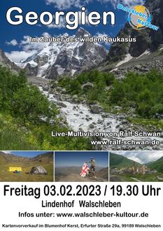 Georgien ist Vielfalt, alte Kulturen, herzliche Gastfreundschaft, kulinarische Höhepunkte und die faszinierend, grandiose Bergwelt des Kaukasus. Durch das wilde Svanetien mit seinen alten Wehrtürmen, die Besteigung des Prometheusberges Kasbek (5033m),mit Packpferden durch das einsame Chewsuretien in die mittelalterlichen Dörfer Shatili und Muzo und weiter hinein in das urig-geheimnisvolle Tuschetien. All das sind Bergabenteuer der Extraklasse. Auch andere Regionen Georgiens, bieten einzigartig Faszinierendes. Der Vashlovani-Nationalpark mit seiner Tier und Pflanzenwelt, Kachetiens Weinregion und kulinarischer Hotspot des Landes oder Dschawachetiens Hochebene und die Vulkanlandschaft im Süden Georgiens, sind einige Facetten der Vielfalt der KaukasusrepublikEiner der emotionalsten Momente war das georgisch-orthodoxe Osterfest bei den Reisen durch das Land. Erleben Sie in Ralf Schwan´s Live-Multivisionsreportage, in eindrucksvollen Bildern, authentischen Video`s und musikalischer Untermalung, ein lebendiges Porträt des Landes zwischen Europa und Asien und lassen Sie sich vom Zauber des wilden Kaukasus gefangen nehmen.