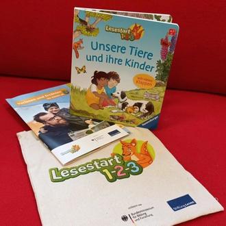 „Lesestart 1-2-3“ ist ein bundesweites Programm zur frühen Sprach- und Leseförderung für Familien mit Kindern im Alter von einem, zwei und drei Jahren, gefördert vom Bundesministerium für Bildung und Forschung (BMBF) und durchgeführt von der Stiftung Lesen. Alle Kinder ab 3 Jahren, bekommen bei uns das Buch "Unsere Tiere und ihre Kinder" mit vielen Klappen zum entdecken und staunen, solange der Vorrat reicht. In der Beiliegenden Broschüre "Vorlesen und Erzählen" findet ihr viele Tipps. Wir freuen uns auf euren Besuch.