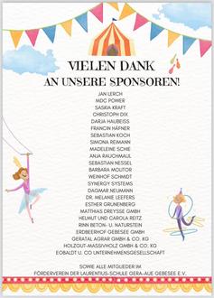 Jan Lerch, MDC Power, Saskia Kraft, Christoph Dix, Daria Haubeiß, Francin Häfner, Sebastian Koch, Simona Reimann, Madeleine Schie, Anja Rauchmaul, Sebastian Nessel, Barbara Molitor, Weinhof Schmidt, Synergy Systems, Dagmar Neumann, Dr. Melanie Leefers, Esther Grunenberg, Matthias Dreysse GmbH, Helmut und Carola Reitz, Rinn Beton- u. Naturstein, Erdbeerhof Gebesee GmbH, Geratal Agrar GmbH & Co KG, Holzgut-Massivholz GmbH & Co KG, Eobaldt u. Co Unternehmensgesellschaft sowie alle Mitgliedern des Fördervereins der Laurentius-Schule GeRA-Aue Gebesee e.V.