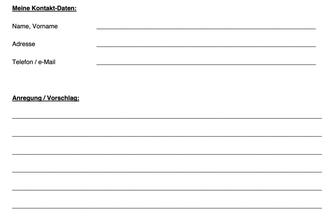 Ihre Ideen können Sie mit diesem Vordruck schriftlich an die Stadt Gebesee, Marktplatz 13, 99189 Gebesee oder per e-Mail an info@stadt-gebesee.de adressieren. Das Formular finden Sie auch auf der Homepage der Stadt Gebesee (www.stadt-gebesee.de).