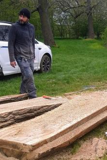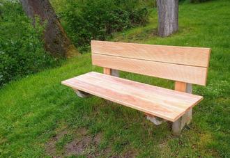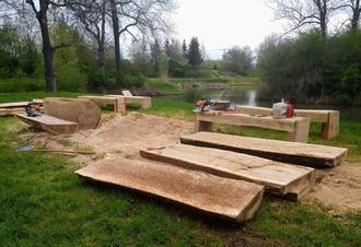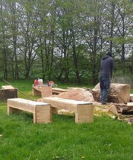 Aus den dicken Stämmen gefällter Pappeln gestaltet er in seiner Freizeit in aufwendiger, uneigennütziger Arbeitsleistung mit der Motorsäge stabile Bänke und Sitzgruppen, die am Schlossteich wieder zum Verweilen einladen sollen.