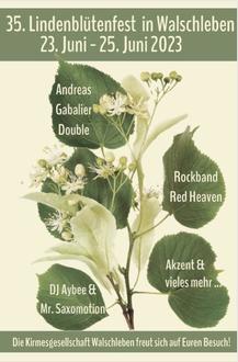Traditionell findet am letzten Juniwochenende das Lindenblütenfest in Walschleben statt. In diesem Jahr lädt Euch die Kirmesgesellschaft Walschleben e. V. vom 23. bis 25. Juni 2023 zum 35. Lindenblütenfest in die Lindenstraße herzlich ein.