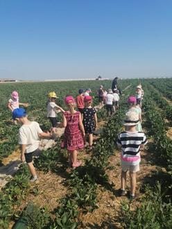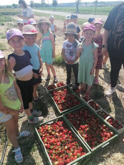 Was für ein Tag! Bei sengend heißer Hitze stampften wir hinaus zu den Feldern, auf denen die süßen Früchte wachsen. Endlich angekommen machten wir es uns im Schatten gemütlich und verspeisten gierig den Inhalt unserer Brotdosen. Danach tobten wir ausgelassen auf der großen Erdbeerhüpfburg! Ausgestattet mit kleinen Körbchen durften wir nun die unendlich langen Reihen der Erdbeerfelder plündern. Unzählige süße Früchte steckten wir in den Mund, so köstlich! Jedes Kind pflückte sein Körbchen voll. Es war sehr anstrengend, weil die Sonne uns auf den Pelz brannte. So bekamen wir auch einen Eindruck davon, was die Menschen leisten, die täglich diese Arbeit ausführen, damit wir Früchte im Supermarkt einkaufen können. Glücklich, durchgeschwitzt und mit dem Bauch voller Erdbeeren bekamen wir auch noch ein erfrischendes Softeis spendiert. Jedes Kind durfte sein gefülltes Bäuchlein und Körbchen mit nach Hause nehmen. Ein wundervoller Tag und ein tolles Gemeinschaftserlebnis.