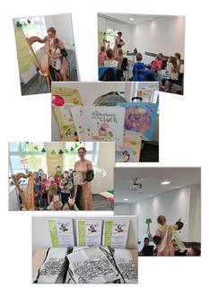 Eröffnet wurde die Lesungen durch die liebevolle Einrichtung ihres Vorleseplatzes und dem Zauberklang von DoroFee und das zum Leben erweckte Zauberbuch im Großformat. Die Begleitung durch Harfe, die Mitmachgeschichten und die passende Kleidung der Autorin, machten die Lesung zu etwas Besonderem. Die Vorschüler empfanden die Lesung sehr angenehm, waren ent- und gespannt und irgendwie im Reich der Drachen verzaubert. Nach der Vorlesung wurden noch individuelle Drachenmasken gestaltet, welche die Kinder dann mitnehmen durften.