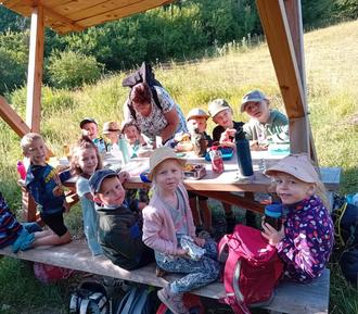Die Mamas und Papas brachten uns zum Treffpunkt und verabschiedeten ihre sehr aufgeregten Knirpse mit einem lachenden und einem weinendem Auge. Los ging unsere Wanderung über Stock und Stein und die ersten 2 Brücken bis zum Picknickplatz. Hier stärkten wir uns erst mal mit dem leckeren Frühstück, das unsere Eltern uns eingepackt hatten.