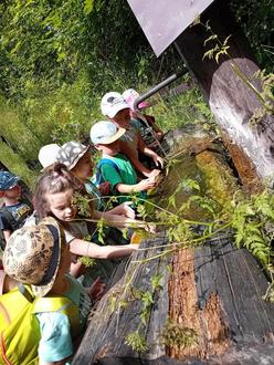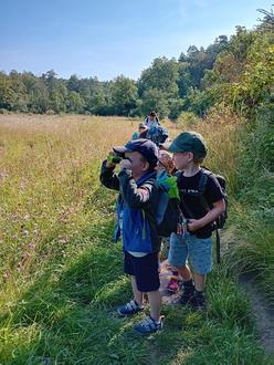 Satt und voller Tatendrang ging die Entdeckungsreise weiter. Viele verschiedene Tiere und Insekten fanden wir auf unserem Weg, besonders die vielen Nacktschnecken waren interessant. Der abenteuerliche Weg führte uns durch Blättertunnel, Brennesselwälder, über umgestürzte Bäume und Baumstammtreppen. Auf der großen Wiese bei dem ehemaligen Kloster machten wir unsere Mittagsrast. Na ja...die einzigen die wirklich rasteten waren unsere Erzieher... Wir Kinder waren beschäftigt mit Budenbau, klettern, Blumen pflücken... Dann machten wir uns auf den Weg um das Haus vom Räuber Hotzenplotz zu suchen, der angeblich im Tieftaler Wald sein Unwesen treiben soll. Die Hinweise verdichteten sich schnell, menschliche Behausungen kamen in Sicht. Plötzlich standen wir vor einem Haus, tief versteckt im Wald. Ein fleißiger Mann und eine Frau waren bei der Arbeit. Der Räuber und sein Eheweib? Auf Nachfrage erfuhren wir, das wir die Grundmühle erreicht hatten und gerade mit dem Besitzer sprachen. Vor lauter Erleichterung waren wir plötzlich sehr müde und gönnten uns eine Rast mit einem leckeren Eis. Ganz wollten wir dem Herrn Grundmüller nicht glauben, dass es keine Räuber mehr im Wald gab, deshalb traten wir sehr wachsam und auf kleinste Spuren achtend den Rückweg an. Zum Glück begegneten wir keinen zwielichtigen Gestalten, sondern nur freundlichen Wanderern.