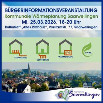 Die Gemeinde Saarwellingen lädt gemeinsam mit der IZES gGmbH alle Bürgerinnen und Bürger herzlich zur Abschlussveranstaltung der kommunalen Wärmeplanung ein.