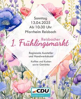 Die CDU Reisbach lädt herzlich zum 1. Reisbacher Frühlingsmarkt ein, der am Sonntag, den 13. April 2025, ab 10:30 Uhr im Pfarrheim Reisbach (Kirchplatz) stattfindet.