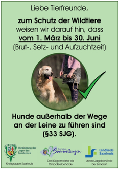 Nach dem Saarländischen Jagdgesetz gilt, dass Hunde außerhalb von Wegen vom 1. März bis 30. Juni an der Leine zu führen sind. Dies dient dem Schutz der Wildtiere während der Brut-, Setz- und Aufzuchtzeit ihrer Jungen.