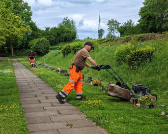 Den Großteil der Friedhofsunterhaltung macht die Rasenpflege aus, welche das Einsäen, Düngen und Mähen umfasst. Ein zunehmender Trend zu Rasengräbern, heute insgesamt 1.691 Stück auf unseren vier Friedhöfen, hat in den letzten Jahren den Mähaufwand erheblich erhöht. Während früher große Plattengräber tendenziell weniger Pflege erforderten, müssen heute immer häufiger kleine Rasenflächen zwischen den Gräbern aufwendig mit Freischneidern und Spezialmähern gepflegt werden. Besonders herausfordernd ist dabei die Grabdekoration: Häufig sind kleine Rasengräber mit mehreren Gestecken, Figuren und Schalen geschmückt – all diese müssen vor dem Mähen entfernt werden. Nach dem Mähen und dem anschließenden Säubern der Grabflächen vom Rasenschnitt wird die Dekoration wieder behutsam an ihren Platz zurückgestellt. Somit erfolgt die Pflege der Friedhöfe in einem rotierenden System – ist der letzte Friedhof gemäht, beginnt die Arbeit wieder von vorn. Von April bis Oktober bedeutet dies: permanenter Einsatz bei jedem Wetter für ein gepflegtes Erscheinungsbild.