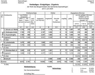 Gemäß §§ 45, 72 des Kommunalwahlgesetzes (KWG) in Verbindung mit § 110 Abs. 3 der Kommunalwahlordnung (KWO) gebe ich hiermit das in der Sitzung des Gemeindewahlausschusses am 11. Juni 2024 festgestellte Wahlergebnis der Wahl zum Bürgermeister der Gemeinde Saarwellingen öffentlich bekannt.