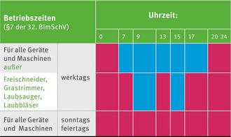 Durch die Geräte- und Maschinenlärmverordnung (32. BImSchVO) vom 29.08.2002 (BGBl. I S. 3478) in der derzeit gültigen Fassung wird die Benutzung zahlreicher Maschinen und Gerätschaften geregelt. So dürfen nach § 7 dieser Verordnung beispielsweise folgende Geräte und Maschinen werktags nur in der Zeit von 07:00 bis 20:00 Uhr betrieben werden: Motorkettensäge, Beton- und Mörtelmischer, Baggerlader, Planiermaschine, Kehrmaschine, Mobilkran, Motorhacke, Rasenmäher, Bauwinde, Förderband, Heckenschere, Fugenschneider, Hydraulikhammer etc. (vgl. Anhang zur 32. BImschVO).