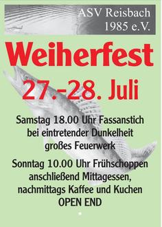 Am 27.07. und 28.07.2024 veranstalten wir unser traditionelles Weiherfest am Ende des Weiherweges in Reisbach. Am Samstag Abend um 18:00 Uhr läuten wir die Sause mit dem Fassanstich ein und unser Küchenteam kümmert sich um die kulinarischen Highlights. Natürlich darf auch dieses Jahr ein pyrotechnischer Höhepunkt nicht fehlen. Mit Getränken und gutem Essen lässt sich die Zeit bis zu unserem Feuerwerk gut überbrücken. Am Sonntag beginnen wir um 10:00 Uhr den Tag mit Frühschoppen. Für das leibliche Wohl in der Mittags- und Abendzeit sorgt auch am Sonntag unser Küchenteam. Darüber hinaus wartet ein reichhaltiges Kuchenbuffet auf Sie. Vorab möchten wir uns bei den leidenschaftlichen Bäckern bedanken, die uns jedes Jahr unterstützen.