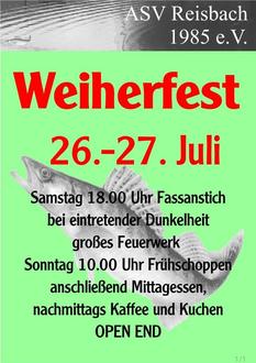 Am 27.07. und 28.07.2024 veranstalten wir unser traditionelles Weiherfest am Ende des Weiherweges in Reisbach. Am Samstagabend um 18:00 Uhr läuten wir die Sause mit dem Fassanstich ein, und unser Küchenteam kümmert sich um die kulinarischen Highlights. Natürlich darf auch dieses Jahr ein pyrotechnischer Höhepunkt nicht fehlen. Mit Getränken und gutem Essen lässt sich die Zeit bis zu unserem Feuerwerk gut überbrücken. Am Sonntag beginnen wir um 10:00 Uhr den Tag mit Frühschoppen. Für das leibliche Wohl in der Mittags- und Abendzeit sorgt auch am Sonntag unser Küchenteam. Darüber hinaus wartet ein reichhaltiges Kuchenbuffet auf Sie. Vorab möchten wir uns bei den leidenschaftlichen Bäckern bedanken, die uns jedes Jahr unterstützen.