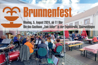 Dieses Jahr veranstaltet das Gasthaus "Zum Adler" am Kirmesmontag, 5. August 2024, wieder in der Saarwellinger Engelstraße sein traditionelles Brunnenfest. Ab 11 Uhr sind alle herzlich zum Frühschoppen eingeladen, bei welchem der Musikverein Saarwellingen zur musikalischen Unterhaltung beiträgt.