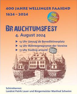 Zum 400. Mal jährt sich die Notiz im Bericht des evang. Pfarrers, dass „die Wellinger an Fastnacht getanzt haben.“ Somit können wir auf ein in der saarländischen Karnevalszene einmaliges Ereignis zurückblicken. An diesen wiederkehrenden Anlass wollen wir mit dem Brauchtumsfest erinnern. Die Gemeinde, der Heimat- und Verkehrsverein und die Karnevalsgesellschaften Gold-Blaue- und Rot-Weisse-Funken veranstalten daher am Kirmes-Sonntag, 4. August 2024, ein Brauchtumsfest mit Umzug und Programm.