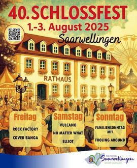 Zum 40. Mal lädt Saarwellingen zum traditionellen Schlossfest ein – und das Jubiläum wird gebührend gefeiert. An drei Tagen erwartet die Besucherinnen und Besucher ein abwechslungsreiches Programm für die ganze Familie. Der Startschuss fällt am Freitagabend um 18 Uhr mit dem traditionellen Fassanstich. Auf zwei Bühnen sorgen zahlreiche Bands für musikalische Highlights – von Rock und Pop über Schlager und NDW bis hin zu Jazz, Latin und aktuellen Chart-Hits.