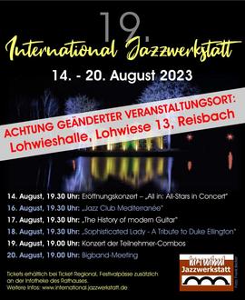 Die 19. International Jazzwerkstatt präsentiert eine Woche exzellenten Jazz vom 14. - 20. August 2023 in Saarwellingen. Tagsüber erhalten MusikerInnen die Chance, von renommierten Jazzgrößen wie Gilad Atzmon, Amos Hoffman, Marta Capponi, Yaron Stavi, Carlo Nardozza u.v.m. unterrichtet zu werden. Abends finden in der Lohwieshalle in Reisbach Konzerte statt. Das "All-Stars"-Konzert eröffnet traditionell die Reihe, gefolgt von Auftritten der renommiertesten Jazzmusiker der Gegenwart. Lassen Sie sich beim Konzert „Jazz Club Mediterranée“ von Rom bis Beirut entführen, tauchen Sie ein in „The History of modern Guitar“ oder lassen Sie sich vom Tribut an Duke Ellington begeistern. Bevor die Konzertreihe mit dem Bigband-Meeting der "Jailhouse Big Band" und dem "Silent Explosion Orchestra" endet, geben die TeilnehmerInnen des Jazzworkshops samstags noch ihr Erlerntes zum Besten. Freuen Sie sich auf eine Woche voller hochkarätiger Jazzmusik!