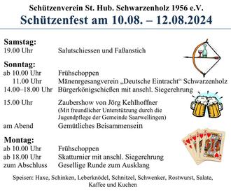 Auch in diesem Jahr dürfen wir Euch wieder ganz herzlich zu unserem Sommerfest am kommenden Wochenende einladen! Wie gewohnt wird das Fest am Samstag von unseren Salut-Schützen eröffnet, gefolgt vom Fassanstich durch das amtierende Schützenkönigspaar. Sonntags findet dann auch wieder das traditionelle Bürgerkönigschießen statt und für die Kinder haben wir sonntags um 15.00 Uhr eine Zaubershow mit dem Zauberer Jörg Kehlhoffner, welche mit freundlicher Unterstützung der Jugendpflege der Gemeinde Saarwellingen stattfindet. Dafür jetzt schon vielen Dank.