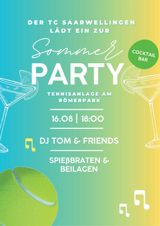 An dem Freitag der ersten Turnier-Woche, am 16.08.2024, veranstaltet der TC Saarwellingen ein Sommerfest, bei dem Live-Musik (Thomas Kurtz alias DJ Tom) und diverse kulinarische Köstlichkeiten angeboten