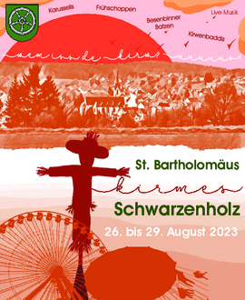 Vom 26. - 29.8.2023 heißt es wieder: "Wem is die Kirw?" - "Uuuuus!", so der Schwarzenholzer Kirwen-Schlachtruf. Auf dem Festplatz sind einige Fahrgeschäfte und Schaustellerbuden aufgebaut und auch kulinarisch hat die „Schwarzenholzer Kirw“ – von Bratwürsten über Pommes bis hin zu den (Achtung Geheimtipp!) traditionellen „Besenbinner-Batzen“ - einiges zu bieten.