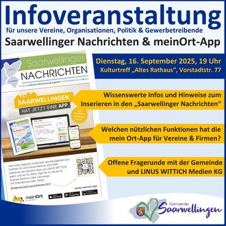 Wir würden uns sehr freuen, wenn je ein Vertreter Ihrer Organisation oder Ihres Unternehmens an der Veranstaltung teilnimmt - insbesondere, da sowohl die meinOrt-App als auch die „Saarwellinger Nachrichten“ als zentrale Plattformen für Informationen aus dem Gemeindeleben dienen.