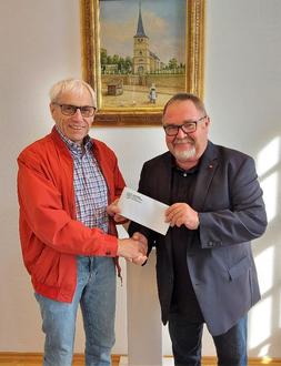 Ortsvorsteher Peter Freichel (rechts) übergibt dem Vorsitzenden des HuVV, Norbert Müller-Adams, (links) mit Freude den bewilligten Zuschussbetrag für die Martinsfeier.
