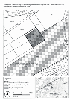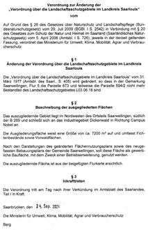 Das Ministerium für Umwelt, Klima, Mobilität, Agrar und Verbraucherschutz - Oberste Naturschutzbehörde - beabsichtigt, auf Grund der §§ 20 und 26 des Bundesnaturschutzgesetzes vom 29. Juli 2009 (BGBI I. S. 2542) in Verbindung mit § 20 des Saarländischen Naturschutzgesetzes vom 05. April 2006 (Amtsbl. S. 726), jeweils in der derzeit gültigen Fassung, die Verordnung über die Landschaftsschutzgebiete im Landkreis Saarlouis vom 31. März 1977 (Amtsbl. des Saarl. S. 405) dahingehend zu ändern, dass eine Fläche von ca. 7.200 m² und er Gemeinde Saarwellingen im angrenzenden Bereich zum Gewerbegebiet Dickenwald aus dem Landschaftsschutzgebiet L03.06.18 ausgegliedert wird.
