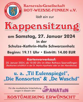 Am 27.01.2024 ist es wieder soweit, wenn es heißt: „Büttenmarsch, Einmarsch für unsere Garden“. Die Rot-Weissen-Funken laden zur Kappensitzung in die Schulze-Kathrin Halle nach Schwarzenholz. Es erwartet Sie wie jedes Jahr ein buntes Programm aus Märschen, Schautänzen, Büttenreden und vielem Mehr. Unsere Akteure stehen in den Startlöschern und freuen sich auf Sie. Wenige Restkarten sind in der Apotheke St. Martin in Saarwellingen erhältlich.