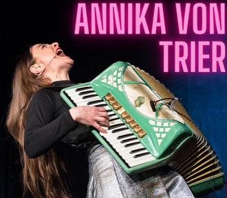 AnniKa von Trier ist ein Wortschopf. Mit ihren sprachspielerischen und gesellschaftspolitischen Liedern am Akkordeon trifft sie - Gerade jetzt! - humorvoll den Nerv der Zeit. Die digitale Überforderung in Jederzeit, erreichbar am Rande des Weltuntergangs mit einer unermüdlichen Stehaufmädchen-Standhaftigkeit sind ihre Themen. Sie besingt den Phantomschmerz, das Zaudern in Zauderspruch, den Überfluss des Überflüssigen in Window-Shopping und Kühlschrank uptown und den Gebäudekomplex als Antwort auf die Wohnungsnot. Die Wertschätzung der Lebenszeit in Prenez-le temps d`aimer und die Liebe zur Natur sind ihr Anliegen. Singen ist für sie die lebendigste Art der Kommunikation mit anderen Menschen, der Dialog mit dem Akkordeon ihr Ausdrucksmittel. Anfang der 90er Jahre fand die Performancekünstlerin als Palma Kunkel, die singende Tellermiene, auf einer Ostberliner Straße ein Akkordeon. Der Beginn einer großen Freundschaft. Seit 1994 ist sie professionell mit Eigenproduktionen international unterwegs beim Adelaide-Cabaret-Festival in Australien, dem Deutschen Haus der New York University, beim Zürcher Theaterspektakel, quer durch Theater in Deutschland und in den schönsten Gärten und Gutshäusern der Uckermark. Seit 2016 ist sie als AnniKa von Trier mit ihren urbanen Liedern am Akkordeon Gerade jetzt! zu erleben. „Ihre Musik springt aus einer Kreuzung aus Chanson und Pop und Jazz. Mit ihrem Akkordeon erscheint sie wie eine Berliner Schwester von Zaz, gut gelaunt und urban.“ (Berliner Zeitung, Cornelia Geißler). www.annika-von-trier.com