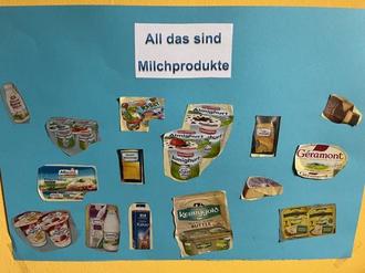Im Stuhlkreis wurde erst einmal Anhand von Einkaufsprospekten nach Milchprodukten erfragt. Die Kinder blätterten beeindruckt durch die Werbung und markierten sich Milchprodukte wie Joghurt, Quark, Käse, Frischkäse und Butter. Diese wurden ausgeschnitten und auf ein Plakat geklebt. Dieses Plakat hängt im Gruppenzimmer aus, um den Kindern Gespräche darüber zu ermöglichen.