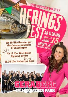 Wir haben uns Einiges einfallen lassen, um euch einen abwechslungsreichen und interessanten Tag zu bieten. Also raus mit der ganzen Familie - und rein in den Morbacher Park - für jeden ist etwas Passendes dabei, auch die Hausfrau kann sich freuen - die Küche bleibt kalt - gegessen wird nach Herzenslust auf dem Heringsfest - und zwar alles rund um den Fisch. Außerdem müssen sie uns besuchen, um unser abwechslungsreiches, ganztägiges Unterhaltungsprogramm mitzuerleben!!! Los geht’s mit einem zünftigen Frühschoppen, in diesem Jahr wieder einmal mit den „Geraberger Musikanten“. Nach dem Mittag wird uns die Well-Blech-Bigband der Musikschule Erfurt mit etwas anderen Blasmusikrhythmen begeistern. Das Repertoire besteht aus berühmten Klassikern der Swing-Ära genauso wie aus Rock- und Poptiteln. Der Nachmittag steht bekanntlich wieder im Zeichen des Schlagers. Katharina Herz wird uns mit ihrem neuen Programm am Nachmittag gut unterhalten. Im Anschluss wird DJ Mario für beste Stimmung bis zum Ende sorgen.