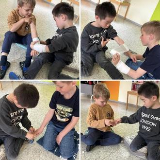 Herr Graf, Rettungssanitäter und Ausbilder beim ASB, zeigte den Kindern worauf es bei der ersten Hilfe ankommt. So lernten sie z.B. wie man sauber und sicher Pflaster klebt sowie Verbände anlegt. Außerdem wurde besprochen wie zu handeln ist, wenn ein Freund oder Familienmitglied ohnmächtig wird. Auch die stabile Seitenlage ist ein wichtiger Teil der ersten Hilfe. Diese wurde, wie alle anderen Handgriffe auch, praktisch von jedem Kind geübt.