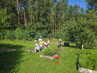 Die Kinder der Kita „Sandhasen am Wald“ ernten und naschen ihre Erdbeeren aus dem Garten.