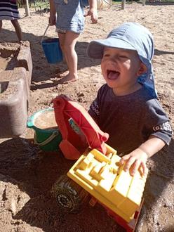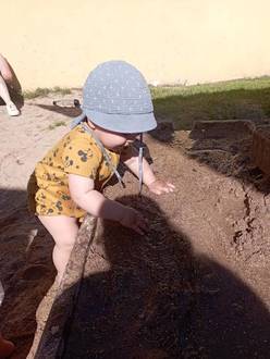 Die Kinder der „Sandhäschen am Wald“ genießen die sonnigen Tage im Garten. Die Kinder spielen am liebsten an der Matschanlage bei den heißen Temperaturen oder kühlen sich am Wassersprinkler ab.