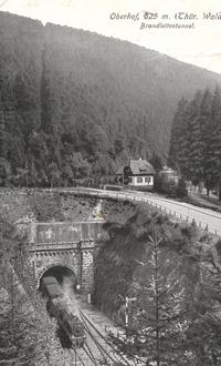 Historisch mussten nach der ersten Reichsgründung 1871 die „Südstaaten“ Bayern und Württemberg an die Preußische Hauptstadt Berlin angebunden werden. Dies ging nur mit einer direkten Eisenbahnverbindung. Das Bergmassiv des Thüringer Waldes stellte das größte Hindernis dar. Um dies zu überwinden, war ein Tunnel die effektivste Lösung. Mit der Entscheidung dem Tal der Wilden Gera zu folgen, sollte dieser unter dem Bergrücken der Brandleite gegraben werden, was dem Tunnel seinen Namen gab. Beiderseitig war ein Bahnhof erforderlich. So kamen die Orte Oberhof und Gehlberg zu ihrem Bahnhof obwohl sie weit weg und hoch oben liegen. Nach umfangreicher Vorbereitung begannen 1881 die Tunnelarbeiten. Durch Sprengung wurde das gelockerte Gestein über Feldbahnloren nach draußen befördert. Täglich kam man 3 bis 4 m in den Berg hinein. Es ist heute unvorstellbar unter welcher Schinderei die Tunnelarbeiter arbeiten mussten, nur durch Rüböllampen der Arbeitsbereich etwas erhellt. Bei ständiger Nässe, Kälte und schlechter Luft waren Krankheiten wie Typhus und Verletzungen allgegenwärtig. Ein Sprengunfall am 7. August 1881 forderte 4 Tode und viele Schwerverletzte. Etwa 100 Bergmänner starben an Typhus. Aber das Werk fand ein für die Region glückliches Ende. Im Februar 1883 erfolgte der Tunneldurchstoß mit einer Genauigkeit, die uns heute nur staunen lässt. Ab dem 1. August 1884 war mit dem Tunnel der durchgehende Verkehr von Dietendorf (Neudietendorf) nach Ritschenhausen- Bayrische Grenze eröffnet. Nach dem zweigleisigen Ausbau der Strecke wurde die Bahn die wichtigste Nord -Südverbindung.