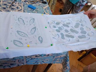 Das Auftragen von heißem Wachs mit den ungewöhnlichsten Werkzeugen, z.B. Zahnbürsten, Spachtel, Nägel, Pinsel ... auf verschiedene Stoffe, wie Leinen, Baumwolle, Viskose Mischgewebe, erforderte schon einiges an Fingerfertigkeit! Es sollten ja Musterungen entstehen, die später eingefärbt werden müssen. Auch das Wachs muss aus dem Stoff entfernt werden.
