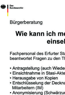 Mitarbeiterinnen und Mitarbeiter des Stasi-Unterlagen-Archivs erläutern in der Zeit von 11.00 Uhr bis 17.00 Uhr die gesetzlichen Regelungen für die Akteneinsicht, z. B. wie der Zugang zu Stasi-Unterlagen zur eigenen Person oder zu verstorbenen nahen Angehörigen beantragt werden kann, ob man Kopien aus Unterlagen sowie die Klarnamen von inoffiziellen Mitarbeitern bekommen kann. Wer einen Antrag auf Einsichtnahme in Stasi-Unterlagen oder einen Wiederholungsantrag stellen möchte, wird gebeten, ein gültiges Personaldokument mitzubringen.