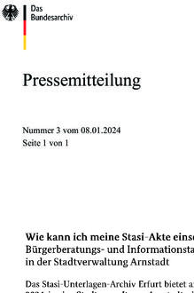 Das Stasi-Unterlagen-Archiv Erfurt bietet am Dienstag, 12. März 2024 in der Stadtverwaltung Arnstadt allen Interessierten die Möglichkeit, sich rund um das Thema Akteneinsicht beraten zu lassen und einen Antrag zu stellen.