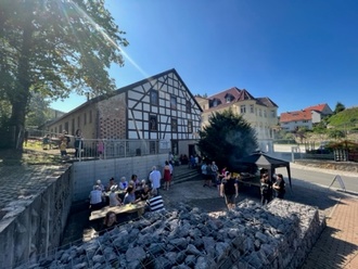 Nach zwei organisatorischen Treffen im Vorfeld wurde am Freitag, den 08.09.2023 angepackt und die Massemühle für den bevorstehenden Denkmalstag gereinigt. In den Tagen zuvor waren bereits Wolfgang Römer und Dieter Ring intensiv damit beschäftigt, defekte Antriebsriemen der Transmission zu reparieren und diese so herzurichten, dass diese sich am Tag des offenen Denkmals bewegt und die Massemühle lebendig werden lässt. Die Dampfmaschine, welche durch Dieter Ring betreut wird, war hier ebenfalls mit eingebunden. Ein großer Dank geht an die Mitarbeiter des Bauhofs, welche in der Vorbereitung den Bereich hinter der Massemühle gereinigt und hergerichtet haben.