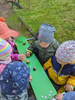 Beobachtet man die Kinder eine Weile, dann fällt auf, dass man im Wald keinerlei Spielzeug benötigt. Da wird jeder Tannenzapfen, ein Ast oder morsches Stück Holz zum Spielzeug, die Kinder sind kreativ. Und je größer ein Ast oder ein Holzstamm ist, umso mehr regt es die Kinder an, diesen zu transportieren.