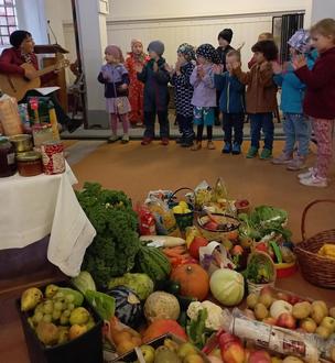 Die Kinder der Kita “Zwergenburg” besuchten anlässlich des Erntedankfestes in diesem Monat die Kirche in Elgersburg. Conny Rieker sprach mit ihnen über die Bedeutung dieses Festes. Wie in jedem Jahr brachten die Kinder geerntetes Obst, Gemüse, aber auch gekaufte Lebensmittel für die Ilmenauer Tafel mit in die Kirche.