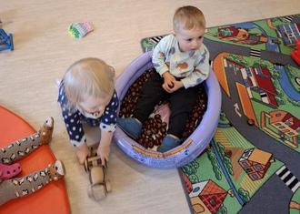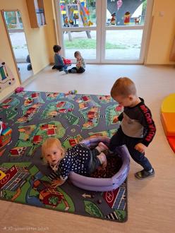 Doch der größte Zauber verbirgt sich im Gruppenraum. Dort war aus einem kleinen Pool ein Kastanienbad geworden, gefüllt mit Hunderten von glatten, braunen Kastanien. Hier können die Kinder baden, springen und spielen. Mit leuchtenden Augen sinken die Kinder hinein, vergraben ihre Hände und Füße in der glänzenden Masse und fühlen das sanfte, kühle Gewicht der Herbstfrüchte. Das Klappern und Rascheln der Kastanien und das gemeinsame Lachen sorgen für eine fröhliche Atmosphäre. Die Kinder tauchen in eine Welt voller fantasievoller Spiele ein und sind begeistert über die schönen Überraschungen die uns der Herbst geschenkt hat.
