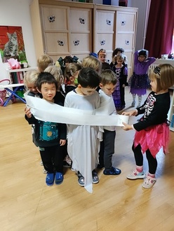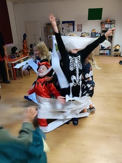 Gruselig verkleidet erschienen die Kinder am 1. November zum Tanzen und Spielen rund um das gruselige Treiben. So war z.B. ein Spinnweben-Parcours zu bewältigen und wurden Geisterzielwerfen, Mumienwickeln und dunkle Versteckspiele angeboten.