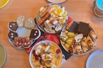 Nach dem ersten Gruseln stand ein gemeinsames Frühstück auf dem Programm. Jedes Kind hatte etwas zum Thema Halloween mitgebracht - von „blutigen“ Würstchen über eine Riesenspinne aus Teig bis hin zu bunten Obstgespenstern. So entstand ein fantasievolles Buffet, das nicht nur toll aussah, sondern auch richtig lecker war.